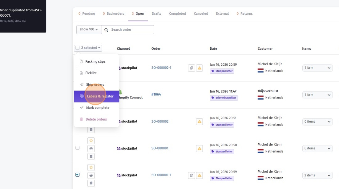 With the Stockpilot 1-Click module, you can process multiple orders in one action and generate all shipping labels instantly. This allows you to ship orders faster, with fewer manual steps and minimal risk of errors.