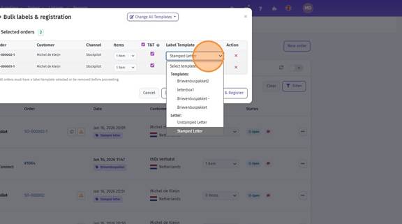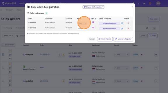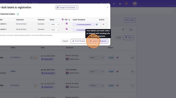 - Choose “Labels & Register” to instantly generate and print your pre-assigned labels and register your orders on the sales channels.