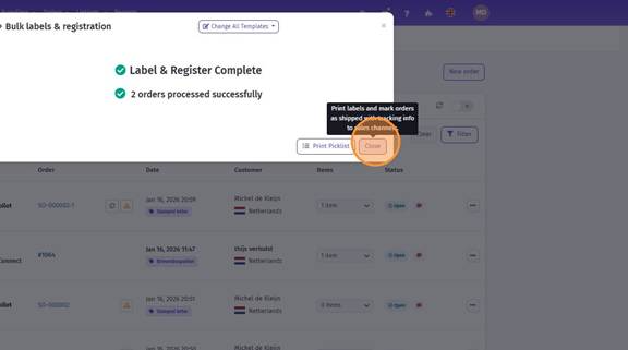 - Close the confirmation: your labels have now been created for each order, and the orders are marked as completed in your sales channels.
