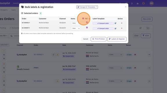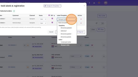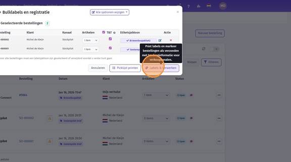- Kies ‘Labels & Register’ om je vooraf toegewezen labels direct te genereren en te printen, en je bestellingen te registreren in de verkoopkanalen.