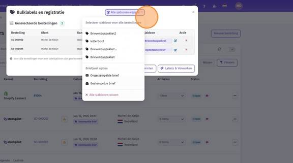 - Klik op het potloodje naast het label en gebruik dit dropdownmenu om het labeltemplate voor een specifieke bestelling te wijzigen.